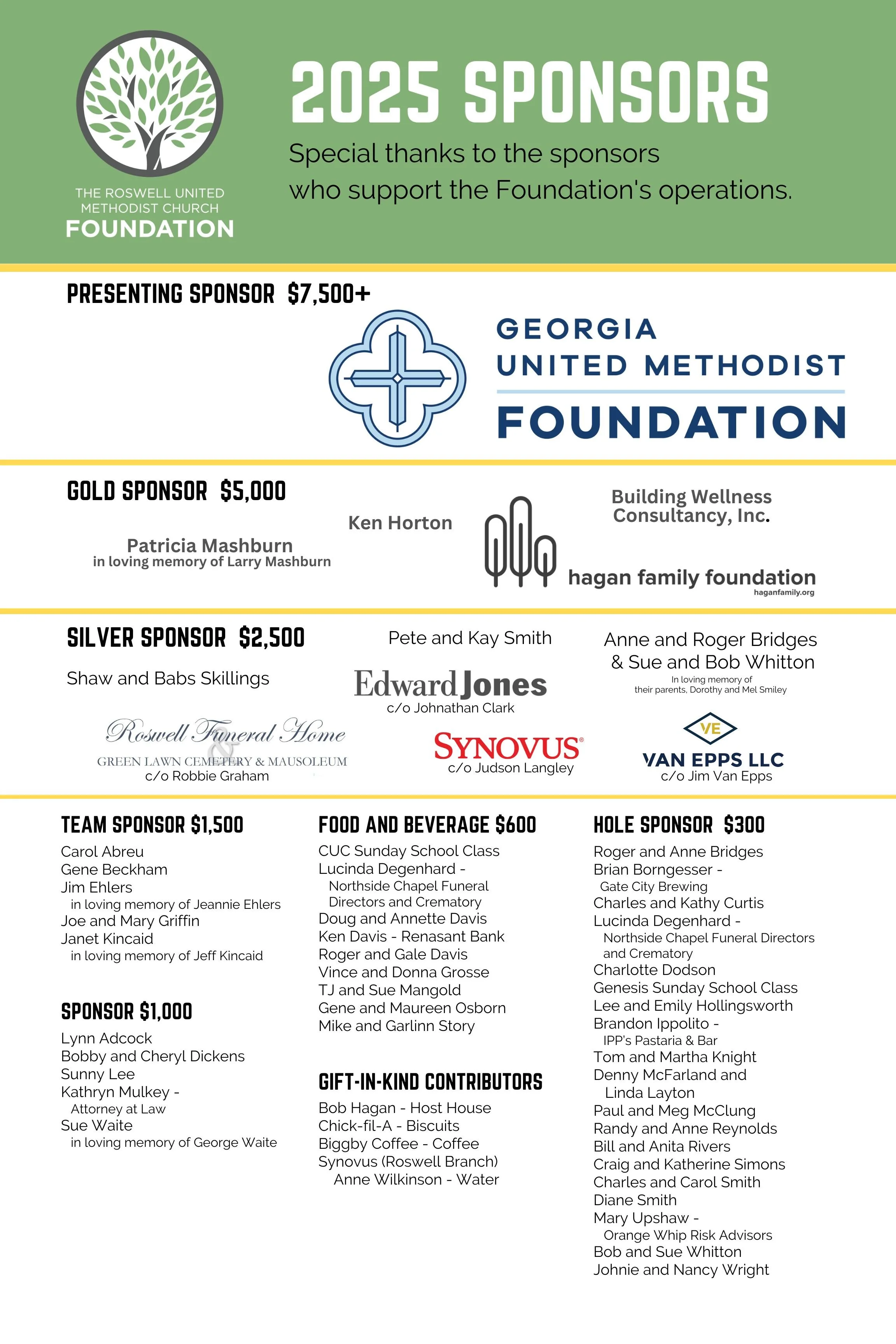 Join us for an exciting day on the green at the beautiful Country Club of Roswell! Tournament registration and access to the driving range begin at 10:00 AM, with a shotgun start kicking off the action at noon. A delicious box lunch will be waiting for you on your cart as you head out for a great round of golf. After the tournament, stick around for a festive grill-out, awards ceremony, and a chance to win fantastic door prizes.